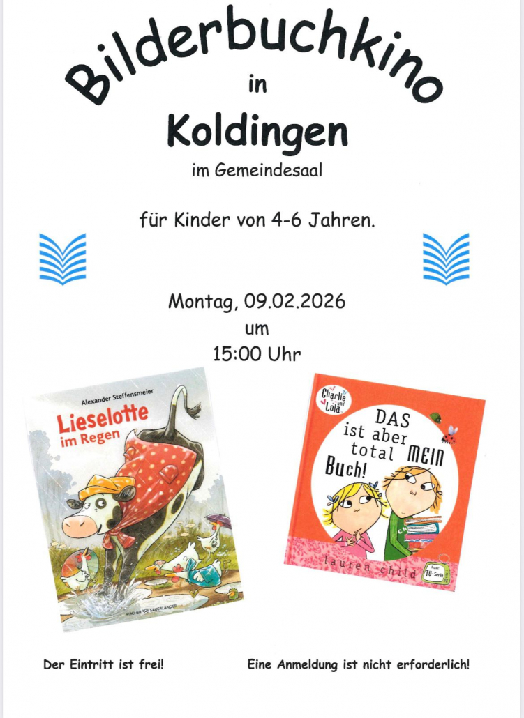 Am Montag, 09.02.2026, hat die Kapellengemeinde Koldingen das Bilderbuchkino der Stadtbücherei Pattensen mit zwei spannenden Geschichten zu Gast. Achtung: Beginn ist ab diesem Jahr bereits um 15.00 Uhr. Das Bilderbuchkino ist empfohlen für Kinder von 4 bis 6 Jahren, der Eintritt ist frei. Eine Anmeldung ist nicht erforderlich.