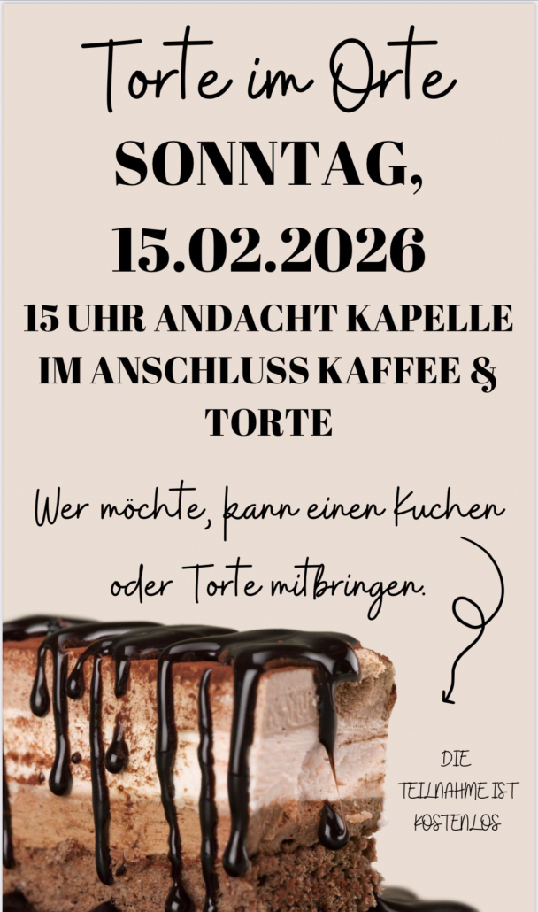 Am Sonntag, 15.02.2026 lädt die Kapellengemeinde Koldingen wieder ein zur „Torte im Orte“. Beginn ist um 15.00 Uhr mit einer Andacht in der Kapelle, im Anschluss wird gegen 15.30 Uhr bei heißem Kaffeeduft das Kuchen- und Tortenbüffet eröffnet. Kuchen und Tortenspenden können sehr gerne mitgebracht werden, aber auch wer nicht backt ist natürlich herzlich eingeladen.
